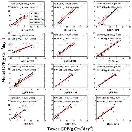 Validation of the SIF-GPP model and the SIF-CO2-GPP model for different EC flux towers. The black dots represent the GPP estimated by the SIF-CO2-GPP model, and the red circles represent the GPP estimated by the SIF-GPP model. The fit lines for GPP of the flux towers and GPPM are indicated by black lines. Fitting lines for GPP for flux towers and GPPS are indicated by red lines.
