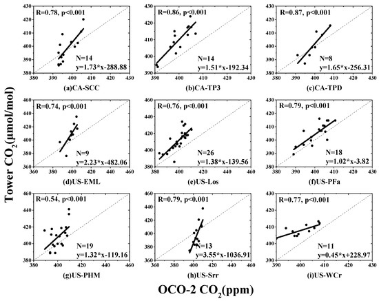 Linear relationships between XCO2 of OCO-2 and measured surface CO2 mixing ratio of EC flux towers. Dots indicate CO2 of EC towers and XCO2 fit points at the flux towers, and black lines indicate the fit line.