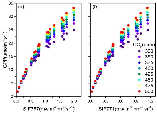 Sensitivity analysis of the effects of different levels of atmospheric CO2 concentrations on SIF-GPP relationship. (a) SIF757 versus GPP; (b) SIF771 versus GPP.