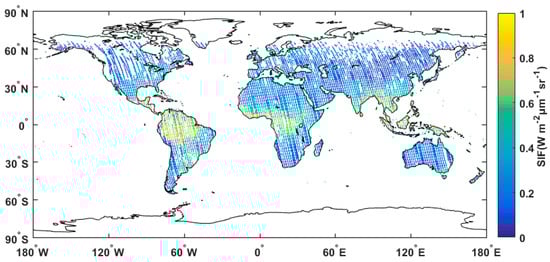 Though the proposed SIF-CO2-GPP model shows promising potentials to map GPP with a better accuracy, there are still several problems to be solved in the future to reach better performance. The uncertainty and limitation of the proposed method are mainly attributed to the following three aspects. First of all, although the spatial resolution of products of OCO-2 satellite is improved compared with other satellites, the footprint is still large compared with those of EC Flux Towers [18]. We demonstrate the footprint of OCO-2 SIF products on October 2014 in Figure 9. As can be seen from Figure 9, the spatial coverage of OCO-2 SIF products is relatively dense between 30°S and 30°N than those in high-latitude regions. That would hinder applications of the proposed method in high-latitude regions where boreal forests locate. Owing to the same reason, there would be a fraction of products of target mode, which would be inappropriate as an input of the proposed model. Even if we had tried our best to select research areas where the vegetation type is uniform, the coarse resolution could still lead to ignorance of heterogeneity in a single pixel, which would eventually reduce the reliability of GPP estimates. The fluorescence detector (Flex) is due to be launched around 2022, which will provide SIF products with finer resolution comparing with those of OCO-2. That would help reduce the error caused by the insufficient resolution of existing SIF products. Moreover, studies have shown that SIF saturates at a relatively low light intensity. This also affects the accuracy of using SIF to estimate GPP [50]. Secondly, the coverage of OCO-2 is sparser than that of MODIS, which results in limited observations for most EC flux towers. This is also a common disadvantage of estimating GPP using satellite-based SIF products with respect to LUE models. As a consequence, the probability of coincidences of the ground stations and the satellite footprints is significantly reduced due to the incomplete coverage of OCO-2. Tackling that problem, we have to lower the criteria for judging coincidences of EC flux towers and SIF products of OCO-2 in this study. Then, such spatial mismatch leads to inevitable errors in SIF, which is the key input of the GPP-estimating model and eventually propagates to estimates of GPP. Consequently, it is of great significance to develop some combined methods to complement the advantages of two different categories of models, namely, SIF-driven models and LUE models. Finally, the SIF data observed in the Target mode is evidently affected by VZA, but in this study, we did not consider this factor. Moreover, we realized that when processing SIF data, the SIF value near 0 should be retained to ensure the accuracy of the experimental results because of the error of the SIF retrieve algorithm. In addition, the impact of CO2 on vegetation is complex, closely related to the growth state of vegetation and the type of vegetation, which calls for further research in the field of botany.