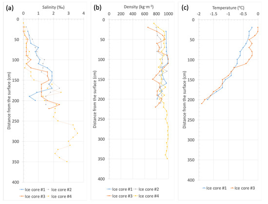 This study focuses on a large sea ice floe in the marginal ice zone of the western Beaufort Sea, north of Alaska, where a field campaign was carried on from August 12 to 15 in 2019 by ice breaker research vessel (IBRV) Araon (Figure 1a). This campaign was the first of two field campaigns that were carried out during the Arctic survey in 2019. Based on an airborne survey by a helicopter and field surveys, the surface of ice floe contained hummocks and wide melt ponds, of which surfaces were frozen at that time (Figure 1b). The surface water drainage could occur well before the onset of freeze-up on FYI, as early as in June [27,28]; however, the perforation was not observed within 100 m radius from the IBRV Araon based on the field campaign. The average air temperature during the field campaign, measured from IBRV Araon, was −0.89 ± 0.70 ℃. The sea ice floe was determined as a multi-year ice, based on the salinity, temperature, and density measurements of 4 ice cores with a diameter of 9 cm, which were extracted at 3 different sites. Each ice core was sliced into 10-cm pieces, where small holes were drilled amid each piece for temperature measurement immediately after the ice was extracted. Ice temperatures were measured in those small holes, using a digital thermometer with an accuracy of ±0.1℃. The salinity was measured using a YSI Pro30 salinometer with an accuracy of 0.1 ppt. The upper part of the ice floe consisted of a fresh low-density layer (600 kg·m−3 for the lowest) lying over higher density layers, and salinity increases to 3 ppt with the thickest ice core of 3.5 m (Figure 2a,b). Temperature decreases almost linearly to the freezing point (−1.7℃) from the surface to the bottom of the ice (Figure 2c).