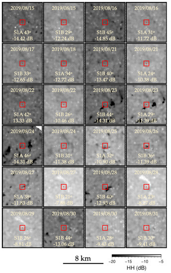 Figure 3 shows radiometrically calibrated Sentinel-1A/B images in HH-polarization which were used for the analysis of the incidence angle dependence, and later of temporal variation. A red square inside each image indicates a sample window of 1 km by 1 km which backscatter statistics were calculated. It is clear that the incidence angle induces substantial difference between the images that were acquired on the same date. It became unclear whether the ice floe completely melted, or the GPS tracker was detached from an ice floe after 1 September 2019 (Figure 4b). Besides, the images between 12 and 15 August 2019 were not used, because they were contaminated by a strong backscattering signal of IBRV Araon in the vicinity of the tracker.