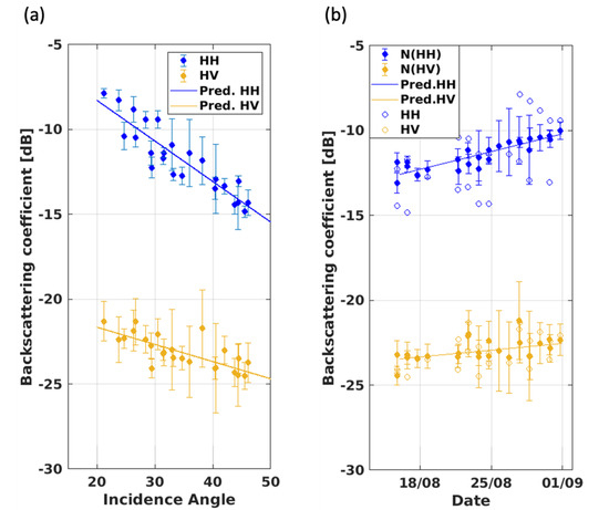 Then, σ0HH and σ0HV decreased as the incidence angle increased with a slope of −0.24 ± 0.02 dB/deg and −0.10 ± 0.02 dB/deg, respectively. The root mean square error from the linear least squares fitting line was 0.73 dB and 0.66 dB, with R2 of 0.82 and 0.59 for HH and HV, respectively, with the confidence level of 99 percent (p-value < 0.01) (Table 2).