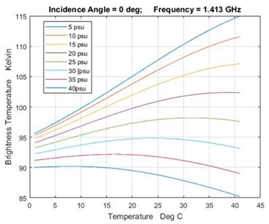 The curves in Figure 2, Figure 3 and Figure 4 were generated using the Klein-Swift model function for the dielectric constant of seawater [19] evaluated at 1.413 GHz, the center frequency of the band in which the measurements from space are currently being made. Assuming a flat surface (no waves) and a homogeneous ocean in thermal equilibrium, one can show [20] that the emissivity of the surface is: