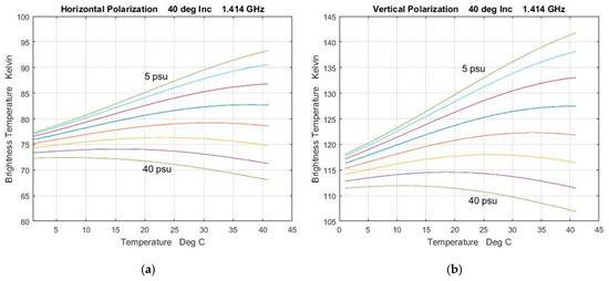 Brightness temperature as a function of SST for constant SSS. The calculations are for a flat surface (no wind) with a frequency of 1.413 GHz and 40° incidence angle. Horizontal polarization (a); Vertical polarization (b). The calculations use the Klein-Swift dielectric constant model function [19].