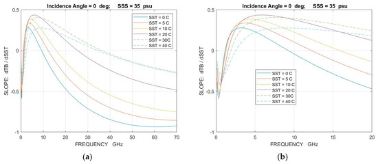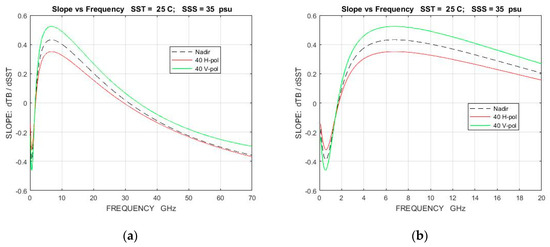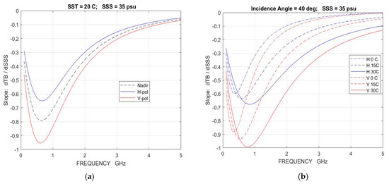 Sensitivity of brightness temperature, TB, to changes in salinity, SSS, as a function of frequency: (a) dependence on incidence angle (SST = 20 °C; SSS = 35 psu); (b) dependence on SST at 40° incidence angle (SSS = 35 psu). These results are for a flat surface (no roughness) and use the Klein-Swift [19] model function for the dielectric constant of sea water. Above 5 GHz, the curves continue the reported trend and converge to 0.