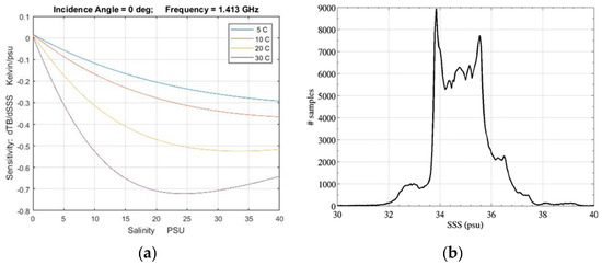 At 1.4 GHz there is also a dependence of the sensitivity, dTB/dSSS, on salinity, but this is mostly important only at low values of salinity well outside the range of values common in the open ocean. This is illustrated in Figure 5. Figure 5a shows the sensitivity, dTB/dSSS, on the vertical axis as a function of salinity on the horizontal axis for several values of SST (at nadir and 1.413 GHz). Figure 5b is a histogram showing the distribution of SSS in the open ocean. The ocean data were taken from in situ measurements made by the global network of Argo floats [25]. Figure 5b shows that the vast majority of measurements are between 33 and 37 psu and from Figure 5a one sees that the sensitivity of brightness temperature to changes in SSS varies relatively little with SSS in this range. Lower salinity can occur in the very cold waters of the Arctic ocean, but even in these regions of extremely fresh ocean waters, SSS is above 25 psu where (Figure 5a) there is limited change in sensitivity with SSS.