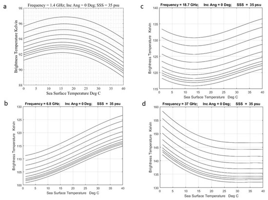 The shape of the curves as a function of SST is different for each frequency. However, for a fixed frequency the shape is stable and relatively independent of WS (i.e., the level curves in each example in Figure 8 are roughly parallel). The general shape of the curves depends on the bulk properties of water and is not a wind driven feature. This can be seen by comparing the shape when WS > 0 m/s with the lowest curve for which WS = 0 m/s. The curve for WS = 0 m/s is determined, by definition in Equation (4), by Єo (i.e., TB = Єo × T when WS = 0 m/s). In turn, Єo is determined by the Fresnel reflection coefficients of a flat surface (i.e., Equations (2) and (3)) and is strongly dependent on both frequency and water temperature (Section 3.2 above). This is further illustrated in Figure 9a which shows brightness temperature, TB, at nadir as function of frequency for WS = 0 m/s and for temperatures of 1 °C, 10 °C, 20 °C and 30 °C. The curves in Figure 8 at WS = 0 m/s are essentially vertical cuts through Figure 9a at fixed frequency. For example, at 6.8 GHz it is clear that TB increases as a function of temperature but at 35 GHz and higher, the behavior is reversed and TB decreases with an increase in temperature. This behavior can be seen in the change of slope of the level curves in Figure 8 from positive at 6.8 GHz (Figure 8b) to negative at 37 GHz (Figure 8d).