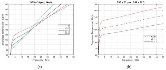 Brightness temperature as a function of frequency: (a) At nadir and several values of SST; (b) SST = 20 °C for nadir and 40° incidence angle. All curves are for SSS = 35 psu, zero wind speed (flat surface) and use the Klein-Swift model function [19] for the dielectric constant of sea water.
