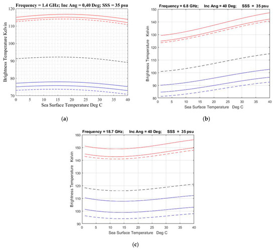Figure 9b and Figure 10 illustrate the behavior with incidence angle and frequency. Figure 9b shows the dependence of TB with frequency at nadir (dashed curve) and 40° incidence angle (red for vertical polarization and blue for horizontal polarization). The dashed curve (nadir) behaves as a function of wind speed and SST as shown in Figure 8 for selected frequencies. Off nadir, horizontal (blue) and vertical (red) polarization behave similarly but with amplitude that depends on polarization. This is illustrated further in Figure 10 which shows brightness temperature as a function of SST at nadir and 40° incidence angle for frequencies, 1.4 GHz (Figure 10a), 6.8 GHz (Figure 10b) and 18.7 GHz (Figure 10c). The red curves are for vertical polarization and the blue curves for horizontal polarization at an incidence angle of 40°. The dashed blue and red curves are for WS = 0 m/s and the solid curves for WS = 7 m/s and 14 m/s. The dashed black curve is for nadir and WS = 0 m/s and is the same as the lowest curve (WS = 0 m/s) in Figure 8a–d. The effect of wind speed is to increase the emissivity and brightness temperature at both polarizations. Comparing the shape of the dashed curves in Figure 10 (zero wind speed) shows that the shape (change with SST) is, to a good approximation, independent of incidence angle; however, comparing the spacing between red lines with spacing between blue lines indicates that the sensitivity to WS does vary with polarization. In particular, the distance between the blue curves (horizontal polarization) is greater than between the red curves (vertical polarization) indicating that the sensitivity to WS is greater at horizontal polarization.