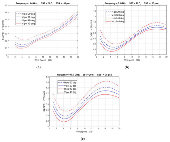Sensitivity, dTB/dWS, of brightness temperature to a change in wind speed for incidence angles of 20o and 40° and SST = 20 °C; SSS = 35 psu: (a) 1.4 GHz; (b) 6.8 GHz; (c) 18.7 GHz.