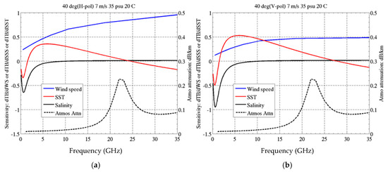 Sensitivity of brightness temperature to WS (blue), SST (red) and SSS (black) for 40° incidence, WS = 7 m/s, SSS = 35 psu and SST = 20 °C. The figures also indicate attenuation due to the atmosphere (dashed line). For attenuation, the vertical axis is attenuation in dB per km at nadir. (a) Horizontal polarization; (b) Vertical polarization.