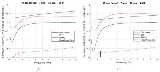 Figure 14 shows the data in Figure 13 with expanded frequency scale for frequency below 10 GHz, which are more representative of those likely to be used for remote sensing of salinity. It can be seen from Figure 14 that using frequencies lower than the 1.413 GHz currently employed for remote sensing from space (i.e., by SMOS, Aquarius and SMAP) will improve sensitivity to salinity (black curve) and decrease sensitivity to wind speed (blue curve). However, there is also a negative consequence because such a change increases the sensitivity to SST (red curve). The protected band at 1.413 GHz (arrow) is almost ideal for its small sensitivity to changes in SST. Thus, moving to a lower frequency to improve sensitivity to SSS will also increase the sensitivity to SST, and a higher sensitivity to SST means a requirement for a more accurate value of SST in the retrieval (see Equation (1)). To counter this need for more accuracy in SST, a frequency more sensitive to SST might be added. For example, something in the vicinity of 3 GHz would provide good sensitivity to SST, independence of SSS and not a large increase in the effect of wind speed (blue). Studies have been reported of sensor designs to accommodate such changes [3,4,5] but as mentioned above, the challenges of such instruments are significant, including the need for bigger antennas at lower frequencies to mitigate the loss in spatial resolution and the presence of radio frequency interference (RFI) in shared and/or unprotected bands (Appendix D). Hopefully, data such as presented in Figure 13 and Figure 14 will help in making the trades necessary in the design of a future instrument.