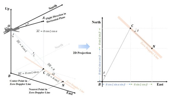 An IRA outputs not only the relative distance (slant range, R), but also the cross-track angle (look angle, ) from an aircraft to the nearest point on the zero Doppler line using the principle of interferometry [11]. The zero Doppler line is perpendicular to the velocity vector of the aircraft [11]. When the direction cosine matrix (DCM) required for converting IRA measurements to relative positions in the ENU coordinate system was calculated using Euler angles as shown in [24], there was performance degradation in a real flight environment [11]. This degradation is due to the angle of attack and the side slip angle caused by wind during flight. Therefore, in this study, to extract precision 3D position information, the effective look angle should be calculated with the IRA look angle , and the virtual attitude calculated by the velocity of the aircraft, as shown in Figure 3 [25].