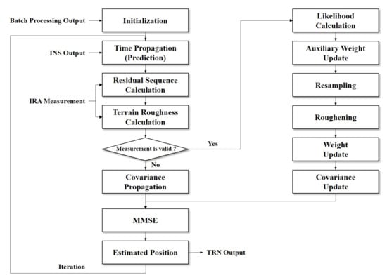 To estimate the precise position by TRN, nonlinear estimation problems have to be solved in real-time [14]. As the EKF locally linearizes the highly nonlinear characteristics of terrains, the EKF-based TRN algorithm can diverge or degrade performance. Recently, to solve this problem, PF-based TRN techniques have been actively studied [27,28,29,30]. Among the various PFs, the auxiliary particle filter (APF) was applied for the tracking mode of TRN in this study. The APF was first introduced by Pitt and Shephard in [28] to improve deficiencies in the general sequential importance resampling (SIR) algorithm. In this study, we used the APF, which is easy to implement and shows stable performance in IRA-based TRN. The APF-based TRN algorithm execution flowchart is shown in Figure 4.