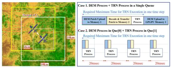 Therefore, in this study, as shown in Figure 5, the DEM patch corresponding to a 10 km × 10 km area is generated based on the current estimated position of the aircraft in the CPU, and then transferred to the SDRAM of the GPGPU. For the aircraft flight from to in Figure 5, there is a 4 km difference from the boundary of the DEM patch generated at the point . At this time, another DEM patch with a 10 km × 10 km area is generated at point . When a DEM patch is generated, the highest resolution DEM among the available DEMs present in the region is selected, and one patch may be made of a combination of several DEMs. When combining DEMs with more than two resolutions, the boundary processing uses the linear interpolation method. Two buffers are created in the GPGPU’s memory for the purpose of storing DEM patches. One (Memory 2 in Figure 5) stores the DEM patch used in the TRN algorithm, and the other (Memory 1 in Figure 5) loads the newly generated DEM patch. When loading of the new DEM patch in Memory 1 is completed, the DEM patch is decoded. This is because the high-resolution DEM is encoded so that the terrain DB can be completely preserved from enemies even when the aircraft crashes. After the decoding step, the new DEM patch must be moved to Memory 2 for the TRN algorithm. If the DEM and TRN processes sequentially, as in Case 1 of Figure 5, and the maximum time of one TRN loop execution exceeds 20 msec, then real-time computation is not guaranteed. Therefore, in this study, two queues (Que[0] and Que[1]) were created in GPGPU as in Case 2 of Figure 5, and the DEM and TRN are processed using a task parallel computing method. The DEM processing itself was also divided in order to prevent the moment of accessing Memory 2 at the same time as the TRN processing.