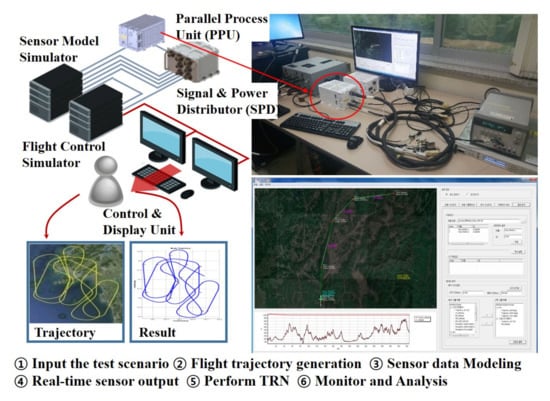 Before the proposed AP-TAN is applied to UAVs, we investigated the feasibility of the navigation performance on a real aircraft platform. As the verification on the aircraft platform through captive flight tests is expensive, the pre-verification through Monte Carlo offline simulation or SIL tests is necessary. In particular, this section deals with SIL test results for real-time verification of the proposed navigation software on the PPU prior to flight tests. Among the navigation algorithms, inertial navigation and INS/GNSS-aided navigation can generally be verified by vehicle testing. However, because the IRA is inoperable on the ground, we developed the SIL test equipment, shown in Figure 6, to verify the TRN and INS/TRN aided navigation.