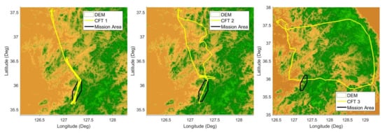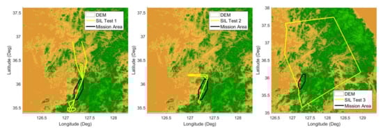 Figure 7 and Table 1 show flight trajectories and simulation conditions for three SIL tests. The area enclosed by black lines in Figure 7 is the mission area, and the 3m resolution DTED level 4 was constructed using light detection and ranging (LiDAR) equipment. The 10 m resolution DTED Level 3 was used for the remaining. The mission area was chosen close to the runway after excluding urban areas, flat areas such as seas and rivers, and military training areas. In SIL Tests 1 and 2, the GNSS was set to be not available within the mission area, and the GNSS was set to be available again after leaving the mission area. On the other hand, in Test 3, GNSS was set to be unavailable after the aircraft had risen above 1km. As shown in Table 1, the average flight altitudes of SIL Tests 1, 2, and 3 were set to 1.3 km, 5.3 km, and 2.3 km, respectively. When GNSS is not available, the INS/GNSS-aided navigation only performs a propagation.