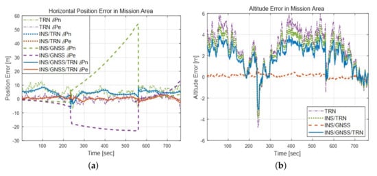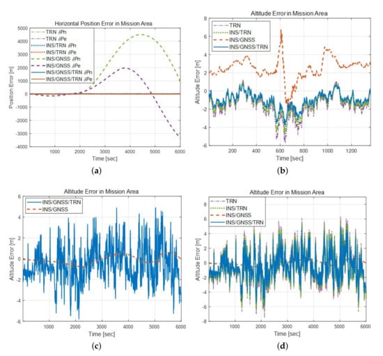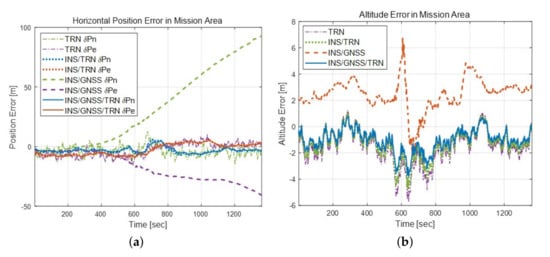 As shown in Figure 10a, because GNSS was unavailable during one hour and 40 min of flight time, the INS/GNSS-aided navigation error increased significantly to the inertial navigation level. In contrast, both the INS/TRN-aided navigation and INS/GNSS/TRN integrated navigation maintained stable performance. As shown in Figure 10b, the INS/TRN performance was degraded because the enough terrain roughness for the reliable TRN performance was not guaranteed between 100 and 1400 s through urban areas. However, it can be seen that the performance of the INS/TRN-aided navigation was restored soon after the roughness was secured. As shown in Figure 10c,d, the INS/TRN-aided navigation and INS/GNSS/TRN integrated navigation altitude errors were generally stable, although they were somewhat larger than the INS/GNSS-aided navigation altitude error, which was almost the same as the barometer’s third damping loop output.