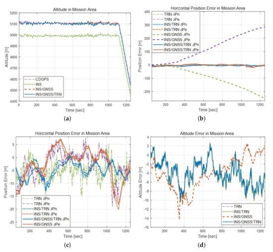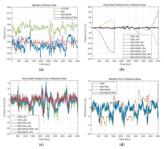 Figure 14a shows that the INS altitude error was about 92.74 m PE compared to the CDGPS data at a 5.1 km flight altitude. Comparing Figure 13a and Figure 14a reveals that the INS altitude error of CFT 2 was larger than that of CFT 1. This was because there was a barometer scale factor error, so the altitude error for flying at 5.1 km was larger than for flying at 1.5 km. In addition, the scale factor error of the barometer was affected not only by altitude, but also by temperature. In the case of CFT 2, as the waiting time increased before the mission was performed, the temperature deviation between the takeoff and the mission was large, which resulted in a larger INS altitude error. On the other hand, the remaining TRN and integrated navigation had similar performances within 4 m PE. Based on these results, we can confirm that the proposed barometer error compensation scheme works in a real environment. As shown in Figure 14b, the CFT 2 performed one test in the mission area in consideration of flight safety under the restrictions of operating with an oxygen mask at altitudes above 5 km. The INS/GNSS integrated navigation error increased continuously after entering the mission area. On the other hand, as shown in Figure 14c,d, the TRN, INS/TRN-aided navigation and INS/GNSS/TRN integrated navigation provided stable performances at a flight altitude of 5.1 km when GNSS was unavailable.