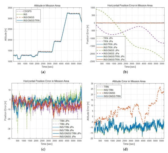 As shown in Figure 15a, the INS altitude error was ~12.47 m PE compared to CDGPS data. On the other hand, the remaining TRN and integrated navigation had similar performances within 7 m PE. The CFT 1 and 2 were performed during a level flight, but in the case of the CFT 3, the altitude error was slightly increased because it was freely flown between 1.3 km and 3.3 km altitudes as shown in Figure 15d, but the results were improved compared to the third damping loop output. In Figure 15b, the INS/GNSS integrated navigation error increases continuously after entering the mission area. On the other hand, as shown in Figure 15c,d, the TRN, INS/TRN-aided navigation and INS/GNSS/TRN integrated navigation provide stable performances at any flight altitude when GNSS is unavailable. As shown in Figure 15d, when the altitude changes, the longer the GNSS is unavailable, the larger the altitude error of INS/GNSS-aided navigation. On the other hand, the altitude of INS/TRN-aided navigation showed stable performance even with altitude change.