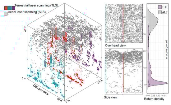 Comparison of aerial laser scanning (ALS) and terrestrial laser scanning (TLS) point clouds for the Great Smoky Mountains site of the National Ecological Observatory Network at plot 053 (40 × 40 m) from oblique, overhead, and side angles. Vertical profiles of return heights from raw LiDAR returns demonstrate the occlusion experienced by both LiDAR methods as a result of their respective view angles (return density refers to the proportion of total points or relative densities of returns from each platform).