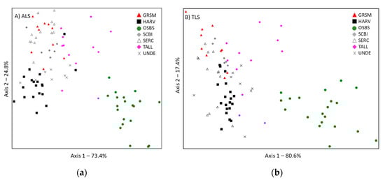 There was strong agreement in the general multivariate classification of plots from different forest sites by ALS and TLS metrics of structural diversity (Figure 4), demonstrating the ability of both systems to resolve forest type differences at the macroscale. NMS ordination of structural diversity derived from ALS data had a two-dimensional solution with mean stress of 7.811, which was significant relative to randomized data (p = 0.004) and explained a 98.2% of the variation in the original data matrix (Figure 4a). The first axis explained 73.4% of the variation and was driven most strongly by the vegetation area index (VAI) and maximum canopy height. The second axis explained an additional 24.8% of the variation and was most strongly driven by vertical variation in canopy height. There was a relatively strong separation between sites in the ALS-based ordination space (Figure 4a), and MRPP analysis indicated significant differences among sites in structural diversity (A = 0.50, p < 0.001). Classification of the TLS structural diversity metrics was also explained in two dimensions of multivariate structural space (Figure 4b). The NMS ordination based on TLS structural diversity metrics had a two-dimensional solution that was significant relative to randomized data (p = 0.004; mean stress = 8.665) and explained a 97.9% of the variation in the original data matrix. The first axis explained 80.6% of the variation and was driven by vegetation area and openness. The second axis explained an additional 17.4% of the variation and was driven by canopy height and internal heterogeneity. NMS ordination of structural diversity derived from TLS data illustrated differentiation among sites (MRPP analysis A = 0.45, p < 0.001). Both ALS and TLS suites of structural diversity metrics provided a similar two-dimensional characterization of plots from different sites (Figure 4a,b), indicating that both LiDAR systems were able to resolve differences in structural diversity of plots from different forest types at a sub-continental scale.