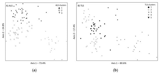 Illustration of canopy structural type groupings derived from hierarchical agglomerative clustering overlaid on non-metric multidimensional scaling ordination of structural diversity across seven studied forest sites; (a) illustrates cluster groups derived from aerial laser scanning (ALS) data and (b) cluster groups from terrestrial laser scanning (TLS) data.