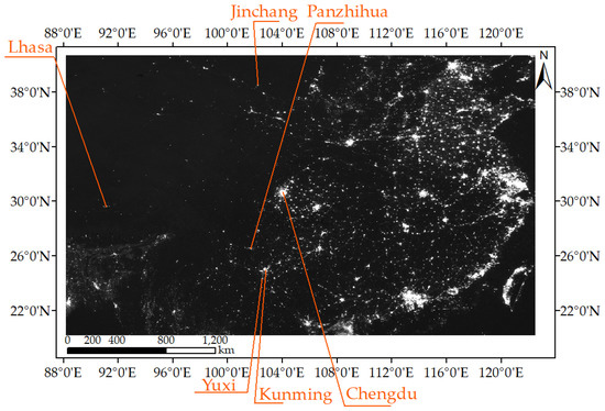 The first Spring Festival following the launch of the Luojia 1-01 occurred on 4–10 February 2019. To compare the nighttime light during the Spring Festival against non-festival, there are two important requirements for the selected city: (1) we require archived Luojia 1-01 images in both the 2019 Spring Festival and a non-festival time for the city, and the images must cover the administrative area of the city; (2) there is no cloud coverage for the images. After conducting an exhaustive search in West China, there are six cities satisfying the requirements and the corresponding Loujia 1-01 images were downloaded from the official data website (http://59.175.109.173:8888/index_en.html) (English version, accessed in November 2019). The steps on how to download Luojia 1-01 data can be found in Ref. [18]. Details of the Luojia 1-01 data used in this study are summarized in Table 1, while the locations of the research cities are shown in Figure 1. Selected portions of the study area from Luojia 1-01 nighttime images and NPP/VIIRS images are comparatively presented in Figure 2. In terms of image details (e.g., roads), the Luojia 1-01 images provide clearer and better-defined silhouettes compared with the NPP/VIIRS images, as shown in Figure 2. The lower spatial-resolution of NPP/VIIRS meant that many targets (e.g., roads) could not be unambiguously identified.