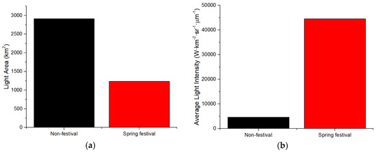 Figure 8. The LA and ALI in the Spring Festival and non-festival in Jinchang: (a) Light Area (LA); (b) Average Light Intensity (ALI).