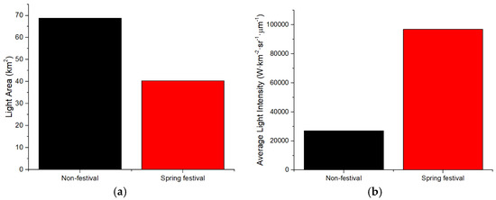 Figure 3. The LA and ALI in the Spring Festival and non-festival in Chengdu: (a) Light Area (LA); (b) Average Light Intensity (ALI).