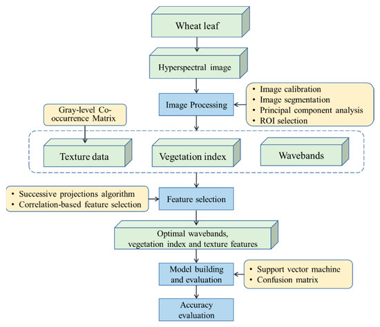 Hyperspectral imaging, a relatively new non-destructive detection technique, has been proved to be useful for monitoring plant diseases in recent years [6]. Hyperspectral imaging provides spectral information on the internal properties of the target (e.g., biochemical composition and cellular structure) and spatial information, such as texture, shape, and color. Several studies on the detection of crop diseases using hyperspectral imaging were conducted. For instance, Yao et al. [7] successfully detected the early symptoms of wheat yellow rust in hyperspectral images using spectral bands chosen using the successive projections algorithm (SPA); the results indicated that yellow rust could be identified at least three days before symptoms appeared. Based on sensitive bands of hyperspectral images, Yao et al. [8] established models for identifying wheat powdery mildew and yellow rust using a least-squares support vector machine (SVM) and extreme learning machine; the identification accuracy of the all models was above 94.58% in this research. Bauriegel et al. [9] used the spectral angle mapper to detect fusarium head blight on wheat and mapped the severity of the disease using chlorophyll fluorescence imaging at multiple stages based on hyperspectral images. Furthermore, Bauriegel et al. [10] developed an index (head blight index) to identify early infection of wheat ears by fusarium head blight; the index exhibited good performance under outdoor conditions. Shi et al. [11] developed a model using the wavelet features extracted from the hyperspectral images for identifying yellow rust on wheat leaves and successfully extracted the lesions of leaves at different times of infection. In addition to ground-based use of hyperspectral images, airborne hyperspectral imaging was also used for crop disease monitoring. Huang et al. [12] quantified yellow rust levels of wheat at the field scale by extracting the photochemical reflectance index (PRI) from airborne hyperspectral imagery. The above studies yielded good results but only focused on the spectral information of the hyperspectral images for monitoring and detection of crop diseases. The spatial information (i.e., texture) of hyperspectral images also contains much information related to diseases, but most studies have not considered this information.