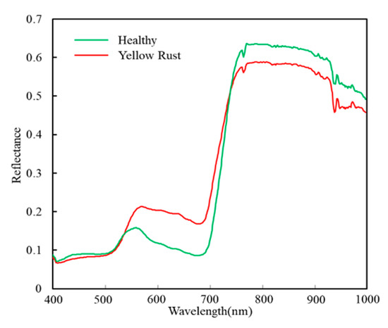 The curves of average spectral reflectance of all healthy and yellow rust-infected samples obtained from seven experiments.
