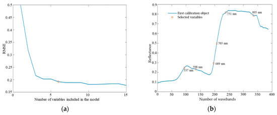 (a) Change of the root mean square error (RMSE) in the successive projections algorithm (SPA); (b) the optimal wavebands (OWs) selected using SPA.