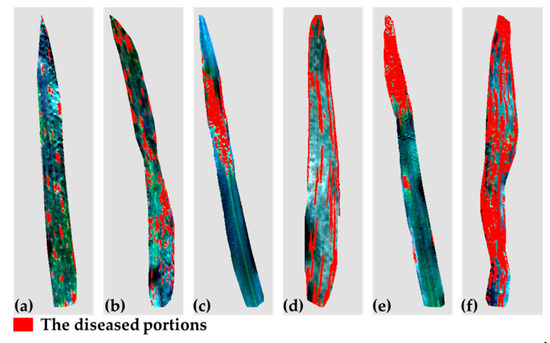 Extraction of yellow rust-infected areas on wheat leaves with different damage levels using the combination of vegetation indices (VIs) and texture features (TFs). The infected areas of (a–f) account for 6%, 20%, 19%, 29%, 25%, and 61%, respectively; the lesions are scattered in (a,b), and (d) and concentrated in (c,e,f).