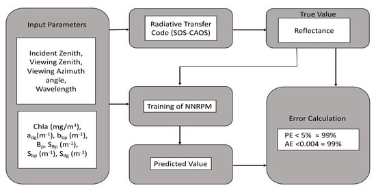 Here, we are focusing on the coastal waters so that the particle size is primarily large. In addition to the aforementioned parameters, viewing zenith angles range from 0 to 87.5° with an interval of 2.5°. The viewing azimuth angles are from 0 to 180° with an interval of 5°. The incident zenith angles are taken from 0 to 85°. The wavelengths used are 385, 410, 440, 470, 555, 670, 760, 863.5, and 870 nm. The aforementioned wavelengths include the ultraviolet, visible and near infrared (VNIR) part of the electromagnetic spectrum. The wavelengths 410, 470, 555, 670, and 863.5 nm are used as part of research scanning polarimeter (RSP) and the rest are adopted based on other existing and new ocean color sensors. The above mentioned bio-optical parameters, wavelengths, incident zenith angles (θi), viewing zenith and azimuth angles were provided as inputs to the radiative transfer code based on successive order of scattering for coupled atmosphere and ocean systems (SOS-CAOS) [,]. There is no atmosphere in our radiative transfer simulation as we are focused on the ocean reflectance model. Glint from the ocean surface can be predicted analytically, which is excluded in this simulation. The output of the radiative transfer simulations were considered as the true or desired value while training the neural network.