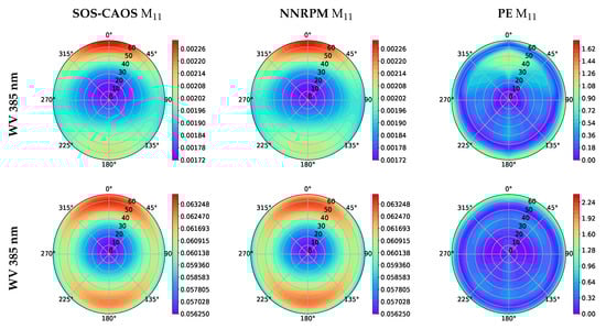 Figure 5 and Figure 6 show the polar plots for the true value (SOS-CAOS), predicted value (NNRPM), and percentage error for the first element of the first column (M11) for two different sets of input parameters for wavelengths 385 and 555 nm. Figure 7 and Figure 8 show the polar plots for the true value (SOS-CAOS), predicted value (NNRPM), and absolute error for the reduced first element of the second column (M12/M11) for the same cases as shown in Figure 5 and Figure 6. For each polar plot, the zenith point is at the center, and the viewing zenith angle of 67.5° is at the rim of the polar plot. The viewing azimuthal angles are shown around the plots.