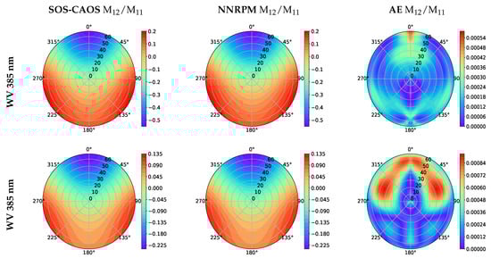 Polar plots of SOS-CAOS, NNRPM and AE for M12/M11 at wavelength 385 nm. Input parameters for Top Row: θi = 55.91°, Chla = 20.43 mg/m3, adg(440) = 7.36 m−1, bbp = 0.097 m−1, Bp = 0.015, SBp = −0.157 nm−1, Sbp = 0.258 nm−1, Sdg = 0.019 nm−1. Input parameters for Bottom Row: θi = 43.02°, Chla = 24.77 mg/m3, adg(440) = 0.004 m−1, bbp = 0.099 m−1, Bp = 0.046, SBp = −0.106 nm−1, Sbp = 0.023 nm−1, Sdg = 0.014 nm−1.