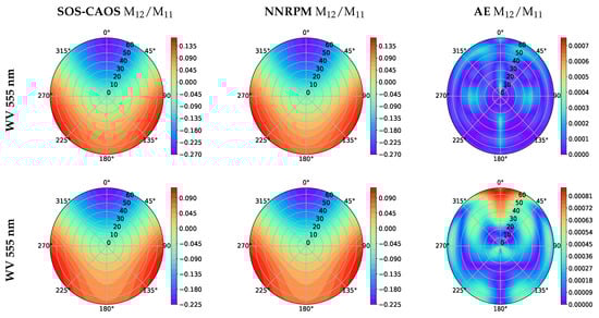 Polar plots of SOS-CAOS, NNRPM and AE for M12/M11 at wavelength 555 nm. Input parameters for Top Row: θi = 55.91°, Chla = 20.43 mg/m3, adg(440) = 0.258 m−1, bbp = 0.088 m−1, Bp = 0.016, SBp = −0.157 nm−1, Sbp = 0.258 nm−1, Sdg = 0.019 nm−1. Input parameters for Bottom Row: θi = 43.02°, Chla = 24.77 mg/m3, adg(440) = 0.0004 m−1, bbp = 0.098 m−1, Bp = 0.048, SBp = −0.106 nm−1, Sbp = 0.023 nm−1, Sdg = 0.014 nm−1.