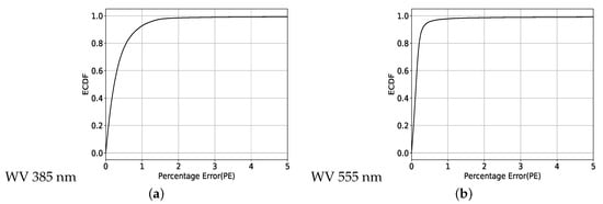 In Figure 9, we have shown ECDF versus PE at wavelengths 385 and 555 nm, which shows that ECDF approaches 1 asymptotically as PE increases and becomes very close to 1 when PE is larger than 5%.