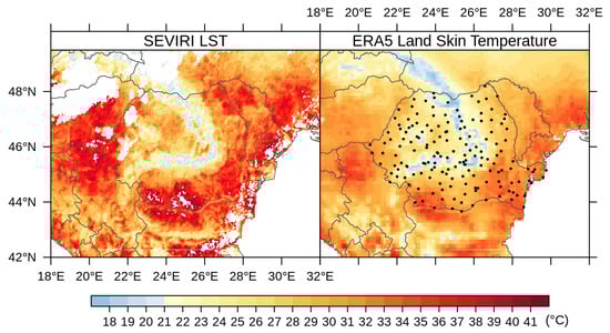SEVIRI LST (left) and ERA5 Land Skin temperature (right): 2017-08-25 09 UTC. The black dots from the right panel are the weather stations of the Romanian National Meteorological Administration.