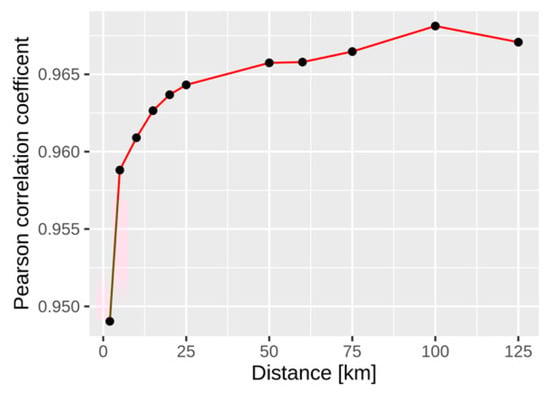 Pearson correlation coefficient (SEVIRI LST vs. ERA5 Land skin temperature) computed on different distances from the LST missing data areas.