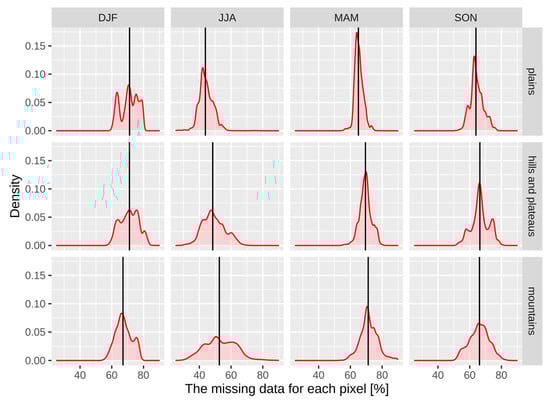 Seasonal density plots of the percentage of the missing LST data computed for each pixel by altitudinal steps. The vertical black lines represent the average percentages of the missing values for each subset of the data.