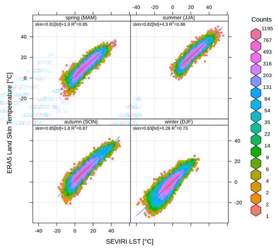 SEVIRI LST vs. ERA5ST (2016–2017), based on randomly selected pixels (300/h). Blue lines shown on the plot are the best fit lines of the linear model between the two analyzed datasets.