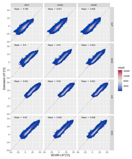 In order to verify the performance of the three models, the seasonal accuracy indicators were computed (Table 2). The performance indicators computed for the GAM2 model are in all cases smaller than the GAM1 and MLR models, whether we refer to the MAE or the RMSE; these results are also confirmed by the calculation CORR, which is higher in all cases than the other two regression models. The estimates of the two GAMs models are superior to the MLR, regardless of the season and the accuracy indicator analysed. The performances of the three models were also investigated with scatterplots of modeled versus original SEVIRI LST data (Figure 5). The very good results obtained by the three models are also confirmed by the grouping of the points around the regression line. The closer value of the slopes to one computed between predictions and original data was also obtained by the GAM2 (the closer the slope is to one, the higher the similarity between the datasets). It has to be noted that better gap-filling performance of GAM2 when compared to GAM1 actually verifies the informal finding of Figure 2 that there is an important closeness to the cloud edge effect and that it can be used statistically to improve the gap-filling procedure in appreciable way.