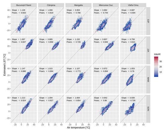 Seasonal scatterplots between the hourly estimated LST and hourly air temperature obtained from five meteorological stations (2016–2017). Red lines represent the best fit lines of the linear model between the two analyzed datasets, and the grey lines are the perfect fit linear models.