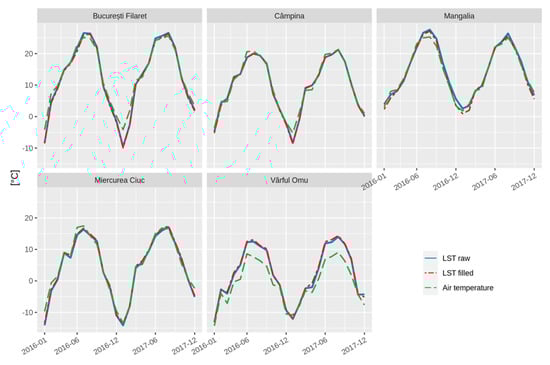 We also compared the raw and filled monthly averages of the LST data with the air temperature aggregated on monthly scale from the weather stations (Figure 7). The reconstructed LST values is almost equal to the raw LST values and slightly lower than the air temperature in the cold season. The poor match observed especially for the cold season at Vârful Omu station is because the LST data is estimated for a very heterogeneous area covering approximately 4.5 km2, while the ground-based measurements are representative only for the alpine conditions of the mountain.