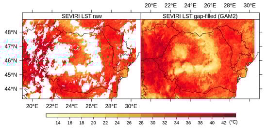 Various archives of geostationary land surface temperature (LST) data products provide high temporal and/or spatial resolution information valuable for analysing the surface urban heat islands, heat and cold waves, monitoring extreme events, etc. Spatial coverage of thermal information over an area can be improved by using the temporal aggregation of data, i.e., going down to a resolution of up to 8–10 days [10,11]. However, the temporally aggregated LST data do not provide sufficiently detailed information for analysing the impact of rapid temperature variations on socio-economic activities or on environment, so that other statistical techniques have been developed for filling in missing data. The combined use of information received from sensors which scan the same surface at different time intervals is commonly applied for filling in missing data from satellite data [12,13]. Nevertheless, this method can be applied only to data provided by polar-orbiting satellites, implying a low temporal resolution of the LST filled information—i.e., 4 images per day—as in the case of MODIS LST.