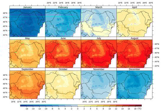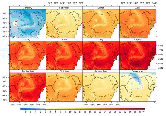 The benefit of using a complete SEVIRI LST hourly dataset is demonstrated by computing some synthesis maps illustrating the spatial distribution of the mean monthly minimum and maximum LST hardly available, which would remain unavailable without performing a gap-filling procedure at fine spatio-temporal resolution. The LST values decreases gradually from the lower areas (lowlands) to the high altitudes (Carpathian Mountains), were almost all the lowest minimum values are located (Figure 9). The thermal inversions clearly occur in January with the minimum values located in the Intra-Carpathian Depression, in the middle of the country where LST values are less than 18 °C. Also, the influences of the warm air coming from the Black Sea can be seen on the maps (south-eastern part of the country), were high LST values occurred in October, November, and January. The south-eastern part of Romania is warmer comparing to the rest of the country in October, November, December, and January, very likely due to the proximity of the Black Sea. The topography strongly biases the spatial distribution of the monthly maximum LST, the altitude imposing as a vertical thermal zonation factor (Figure 10). The thermal inversion phenomena are also observed in January, when certain areas located in the southern vicinity of the Carpathian Mountains are warmer (0–2 °C at 600–800 m a.s.l.) than the lower lands from the southern plain (−4 to 0 °C at 100–400 m a.s.l.).