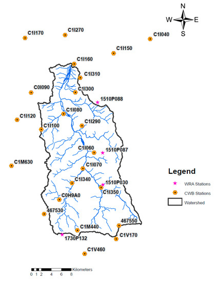 - Thiessen, A.H. Precipitation averages for large areas. Mon. Weather Rev. 1911, 39, 1082–1084. [Google Scholar] [CrossRef]